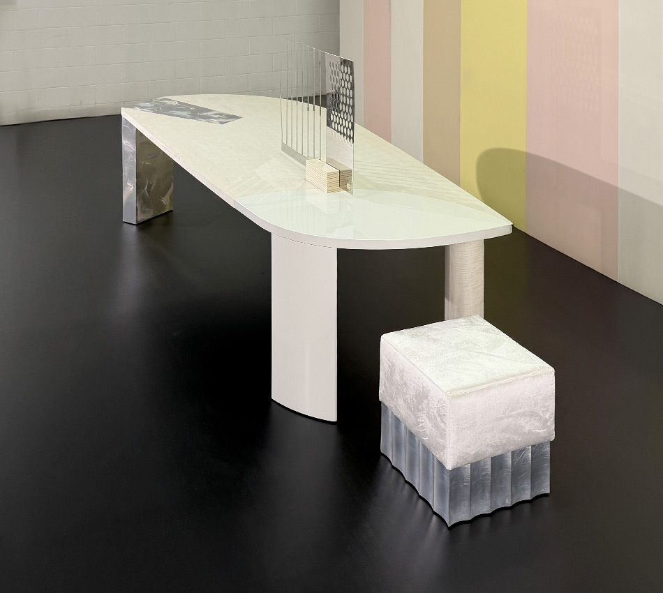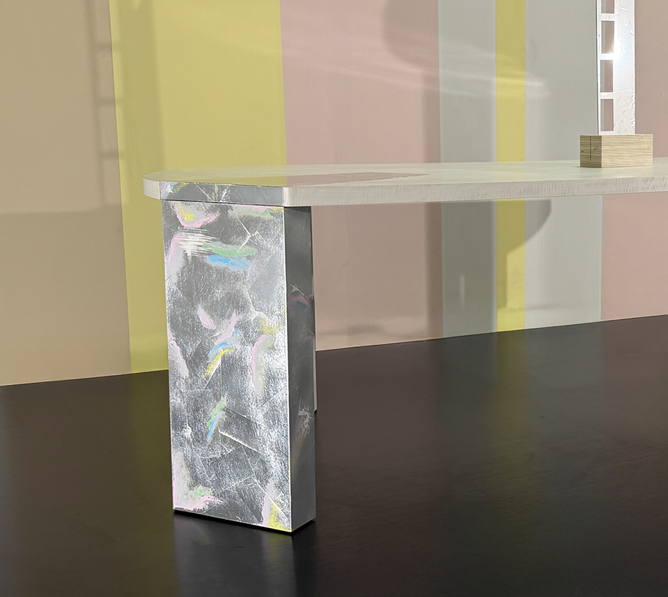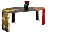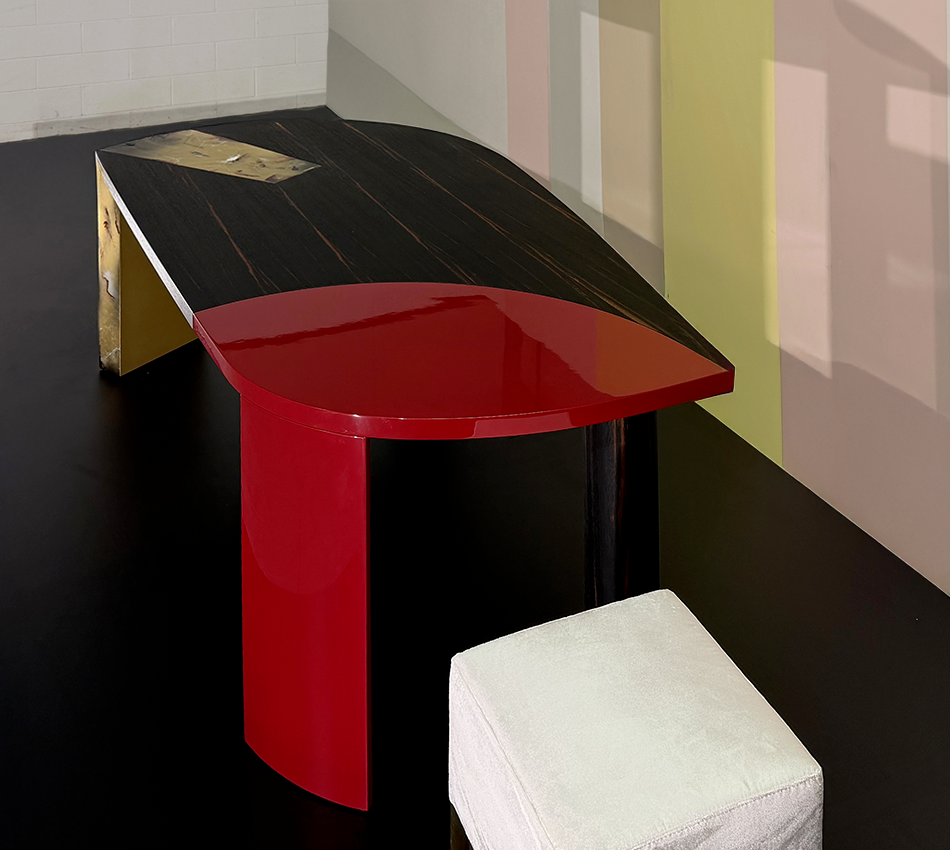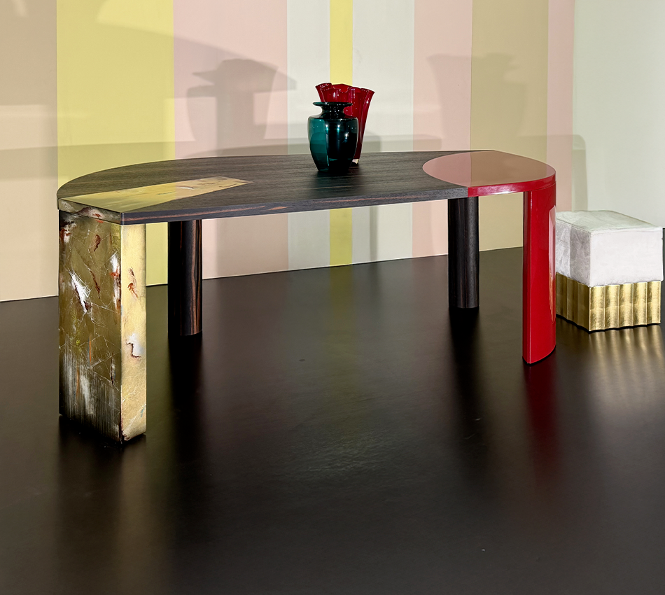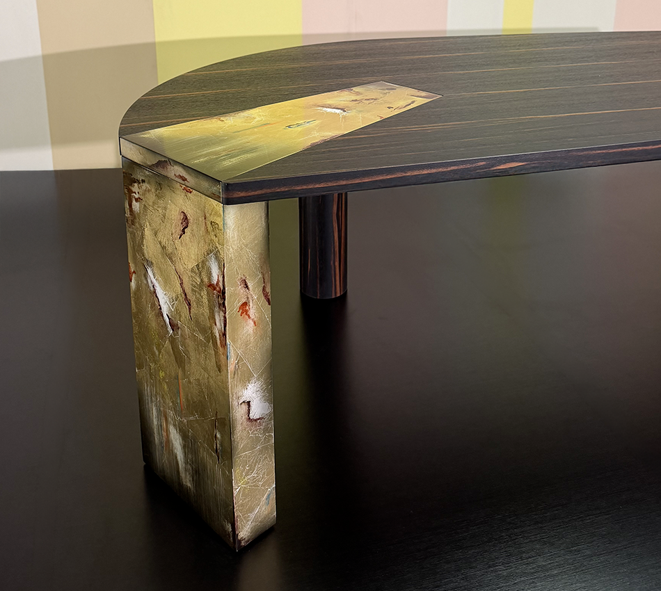 Come in una partitura musicale, una composizione di diversi elementi che si contrappongono per dare origine a una forma scultorea. Rielabora il concetto di tavolo da pranzo attraverso una nuova forma e materiali preziosi quali l’Ebano Amara, l’Acero Frisé, la foglia d’oro e d’argento dipinte a mano.